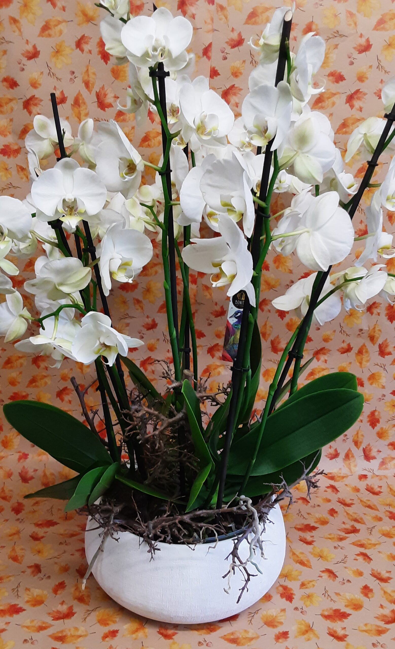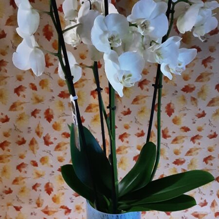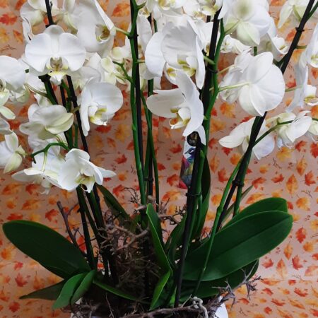 An elegant large white spray including roses, hydrangeas and other seasonal flowers and foliages. H40cm x L140cm x W54cm. The garland has clusters of ivory roses. Other colourways available, ask for details.