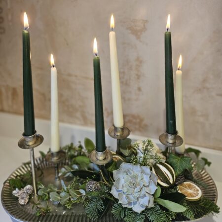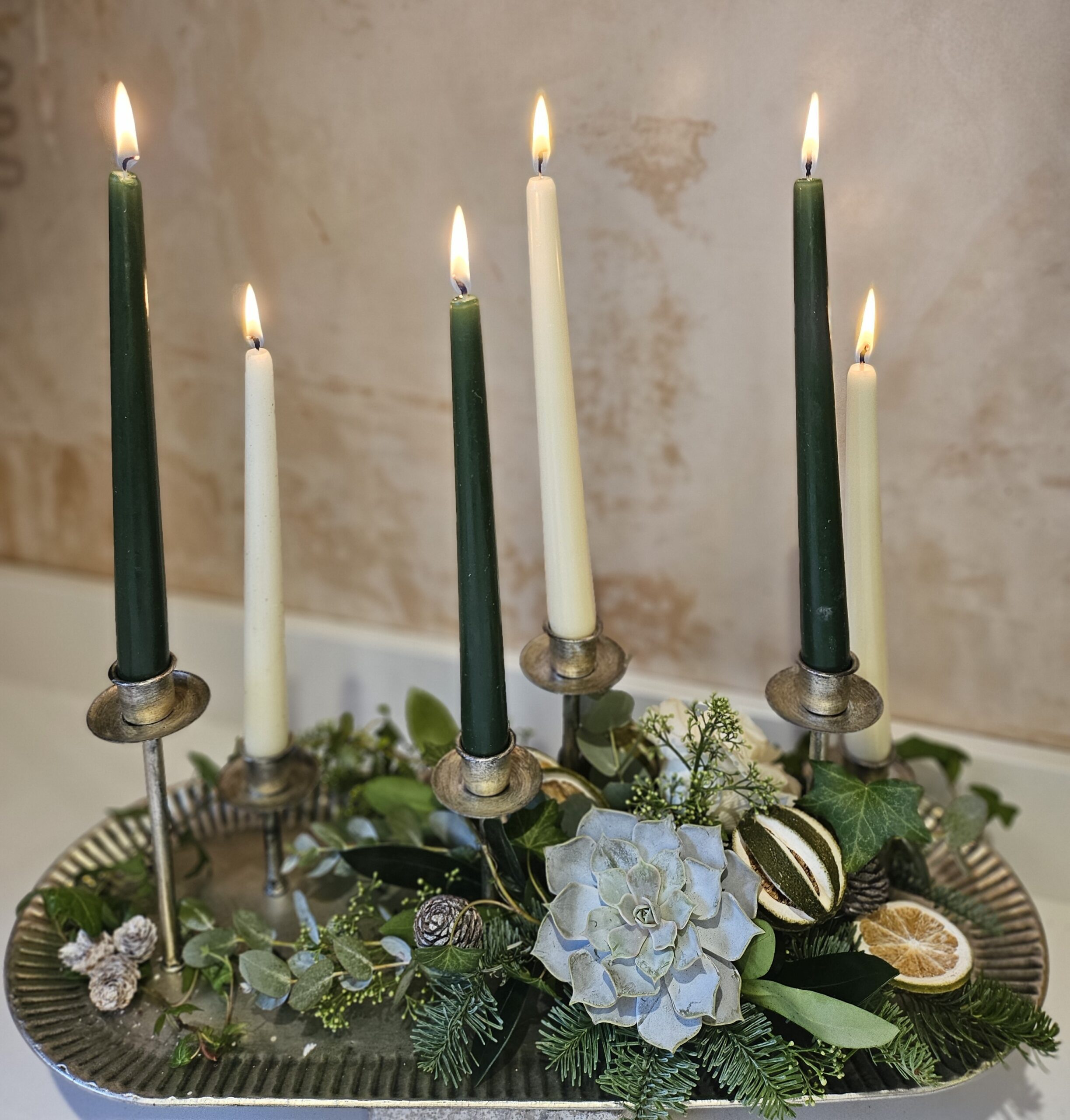 A long ‘silver style’ metal candle holder that will certainly adorn any Christmas table. It has everything, candles, flowers, fruits and seasonal foliages. 6 candles are included and it can be stored for festive use in the future. L 54cm x 22cm.