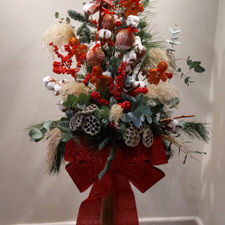 A very attractive floral gift which can be used as a table arrangement that can be lit during the festive season or just used as a decorative piece anywhere in the house. The ceramic planter is filled with not only the candle but a selection of cones, berries and mixed foliages including cinamon sticks. 32cmH… Continue reading Christmas Tree Candle Arrangement