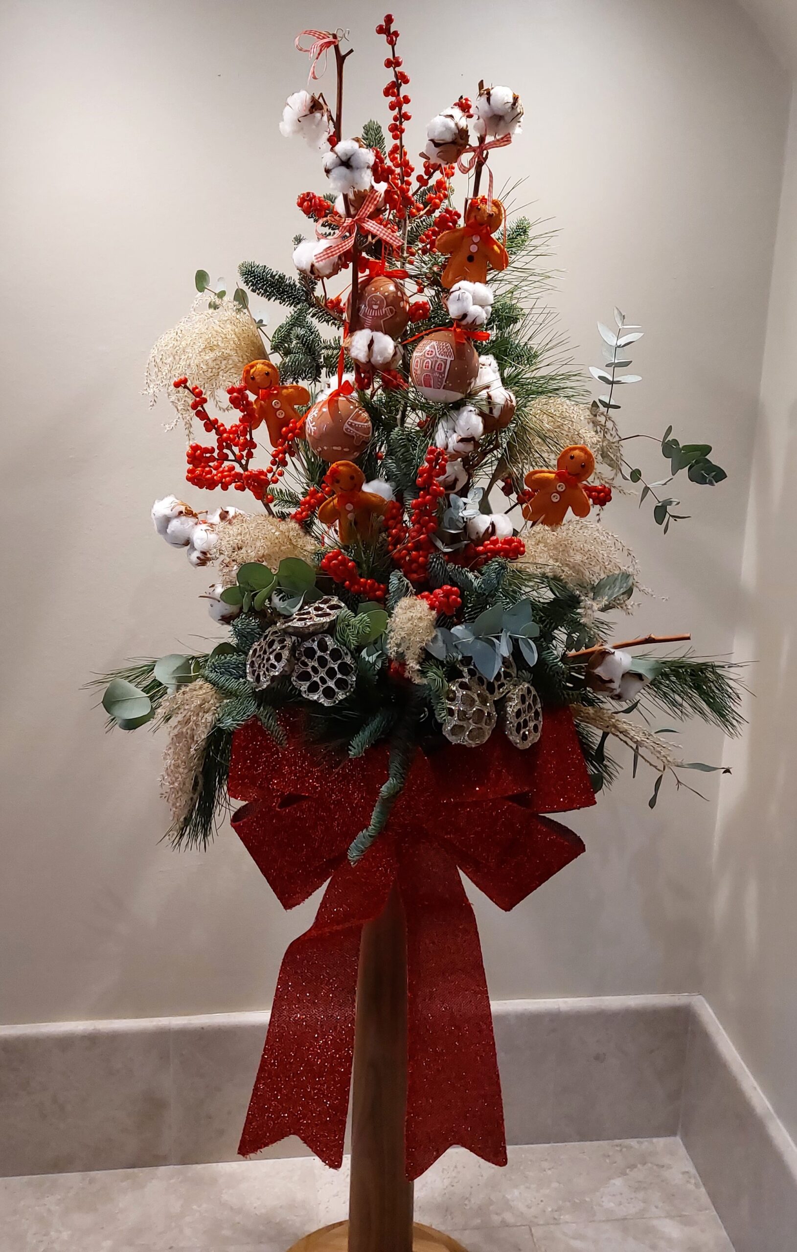 A glass vase filled with mixed foliages and berries that are sprayed with ginger to add a beautiful seasonal aroma to a house during the festive season. We have also added a felt gingerbread man to add a unique twist to the vase. 15 x 10cm jar, overall 30 x 30cm. Extra decorations not included.