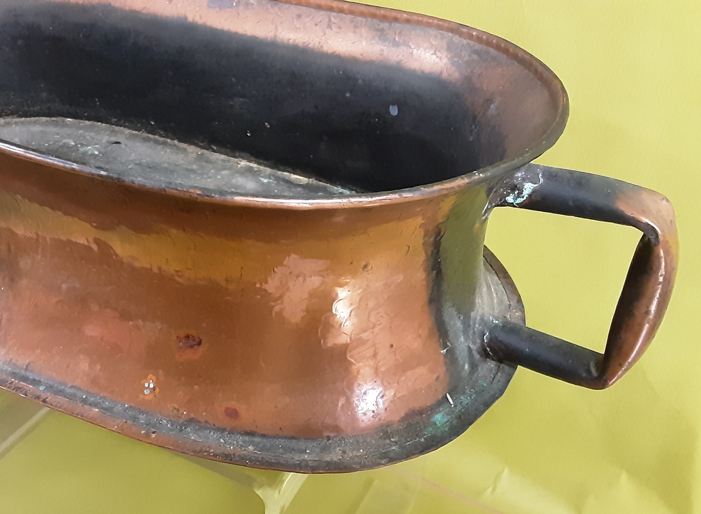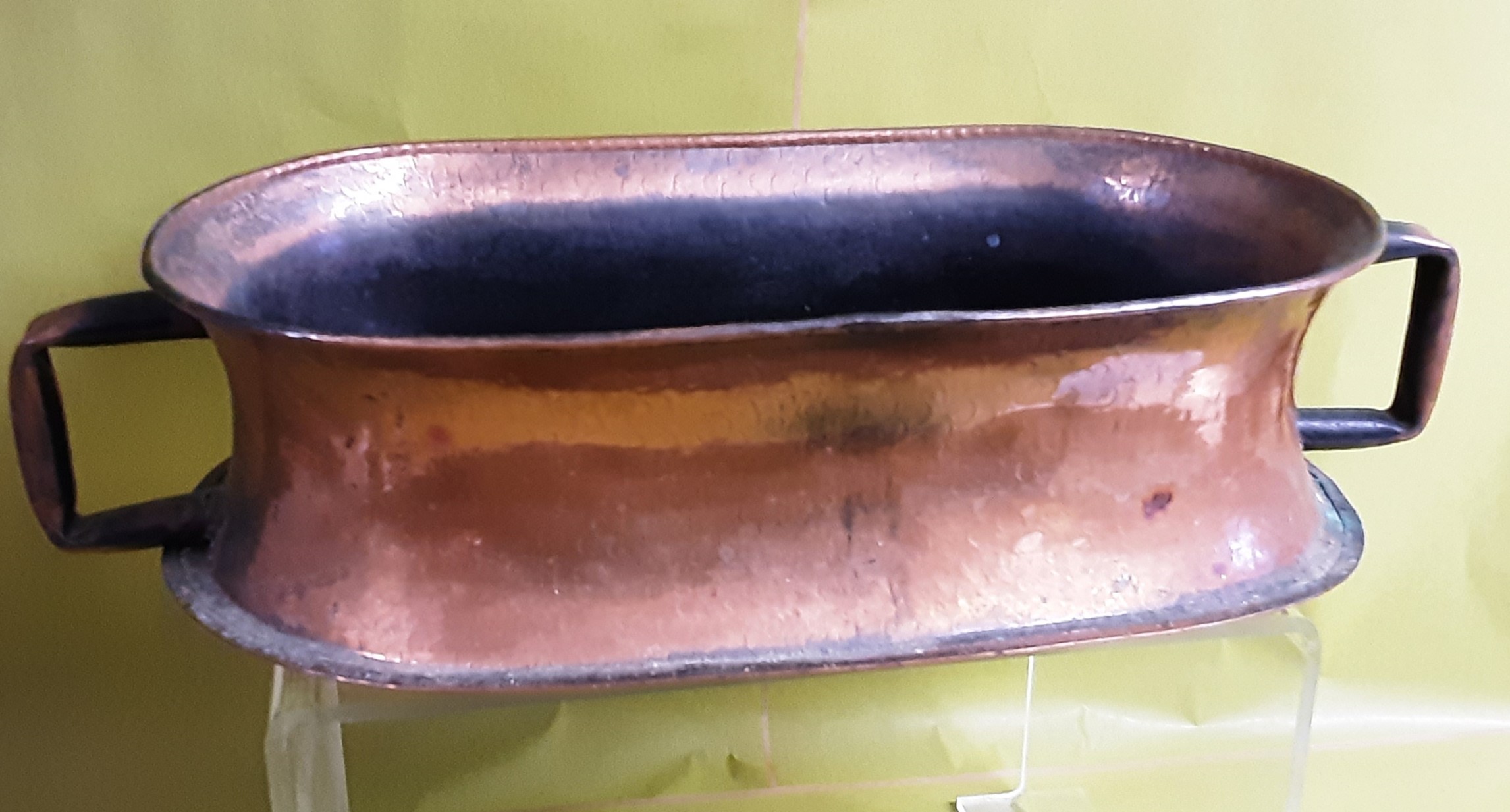 A very attractive copper trough for displaying plants or flowers. Width including handles 45cm x depth of 10cm.
