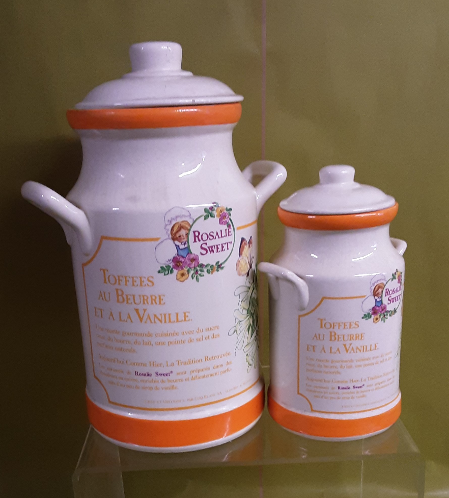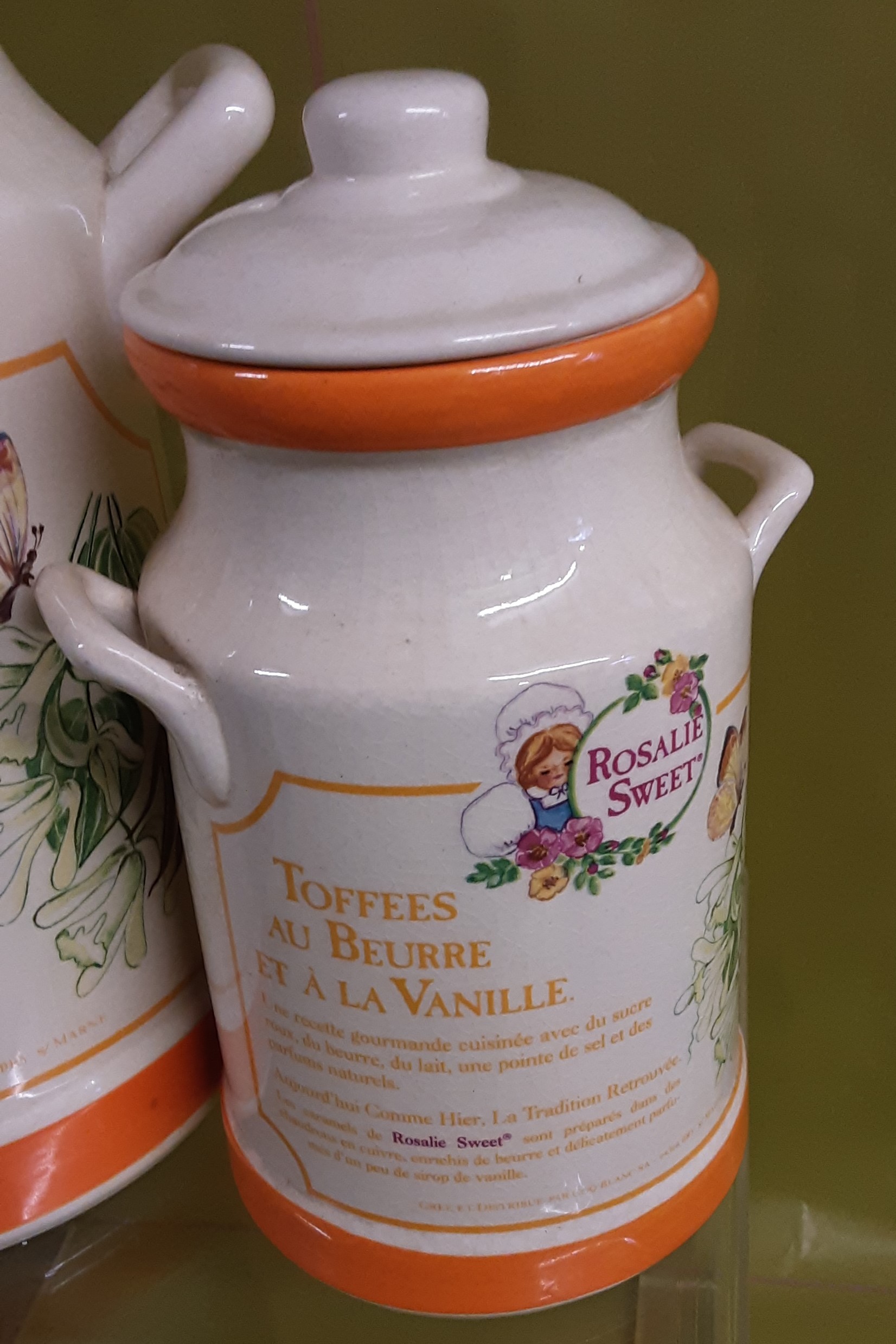 A pair of pretty ceramic Toffee jars with lids. Large 33cm H, small 22cm H.