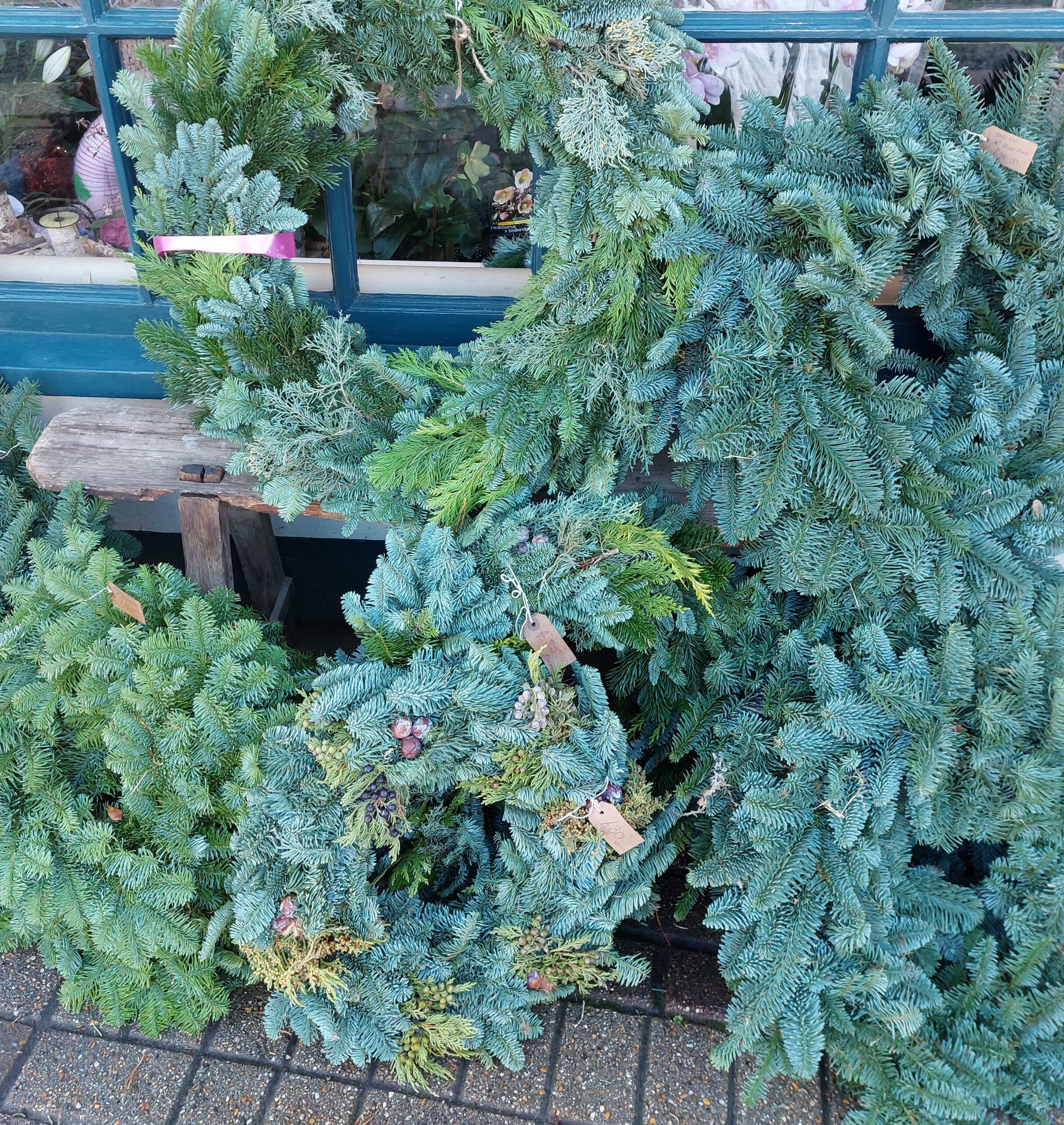 We have a good selection of fresh, blue pine wreaths in different sizes. Call 01737 248484 for details.