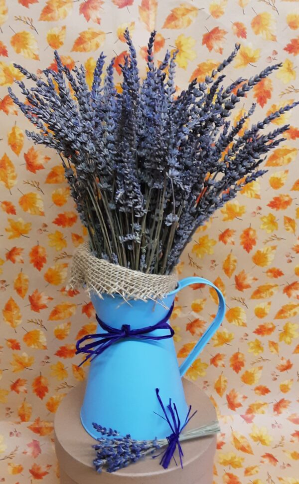 A pale blue enamel jug filled with highly perfumed dried Lavender. A perfect long-lasting gift.