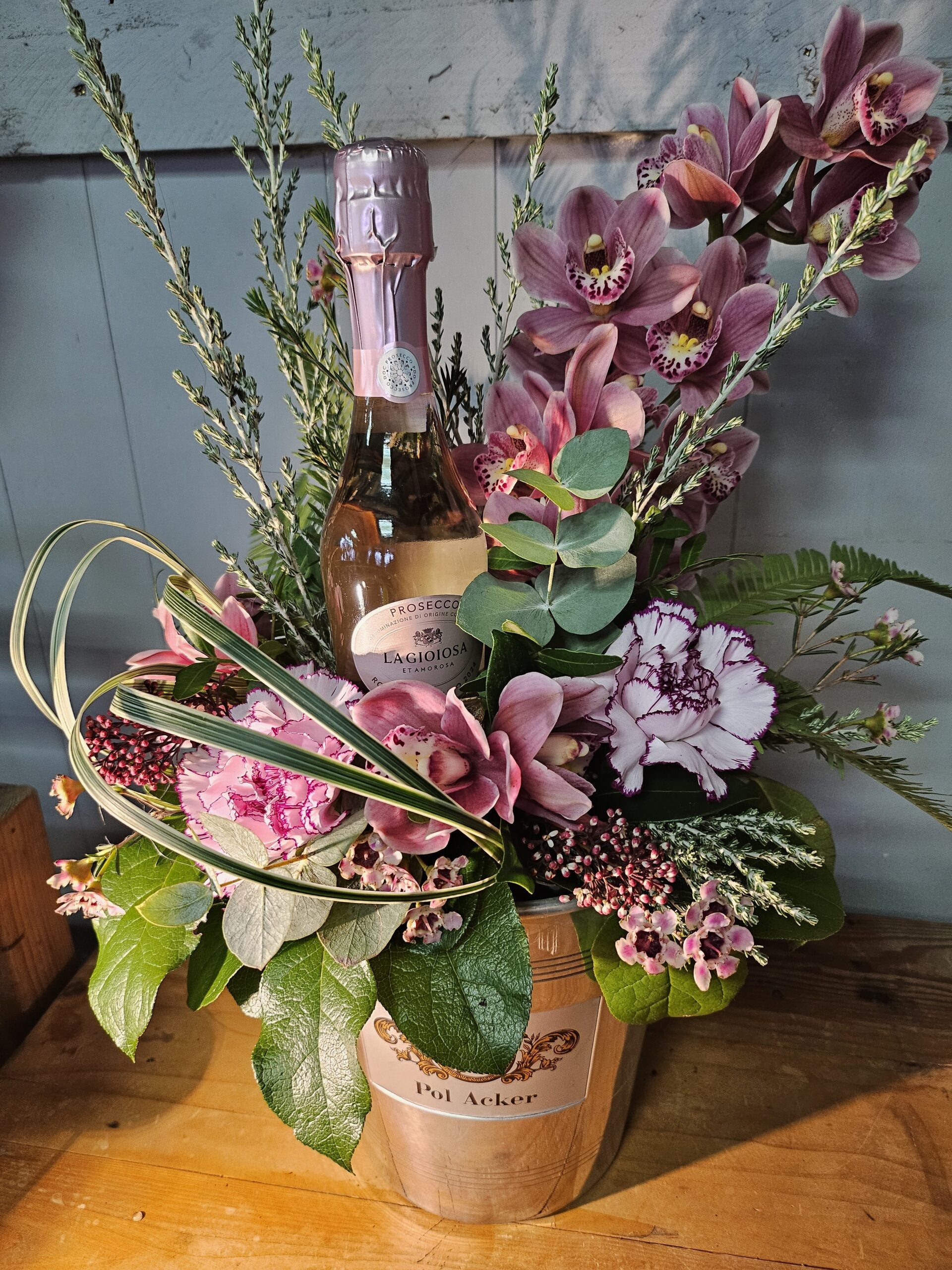 A full size French vintage ice bucket filled with mixed seasonal flowers including an orchid spray, a small bottle of pink Prosecco is included. Ice buckets may vary according to stock.