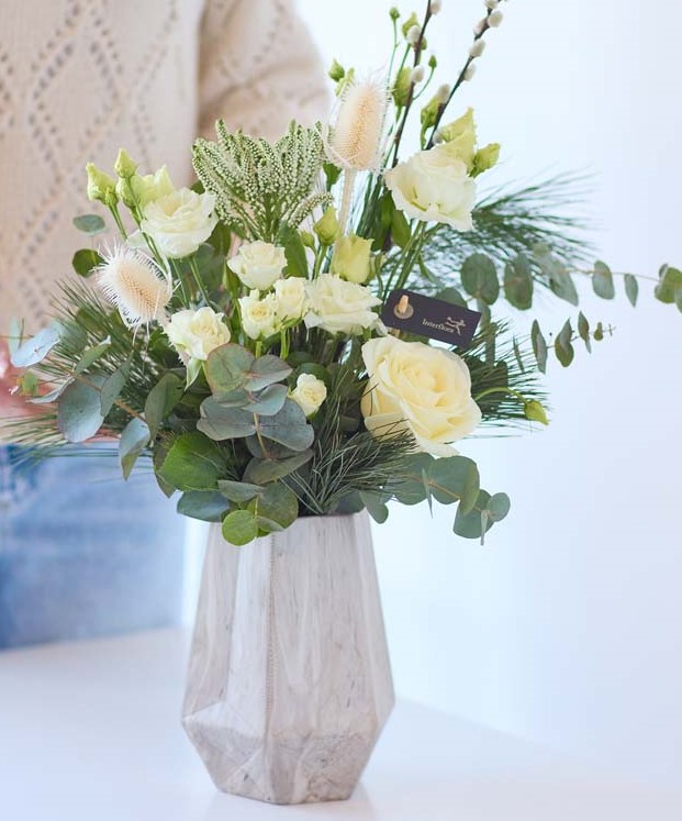 A striking angular grey vase filled with winter-inspired fresh and dried flowers.