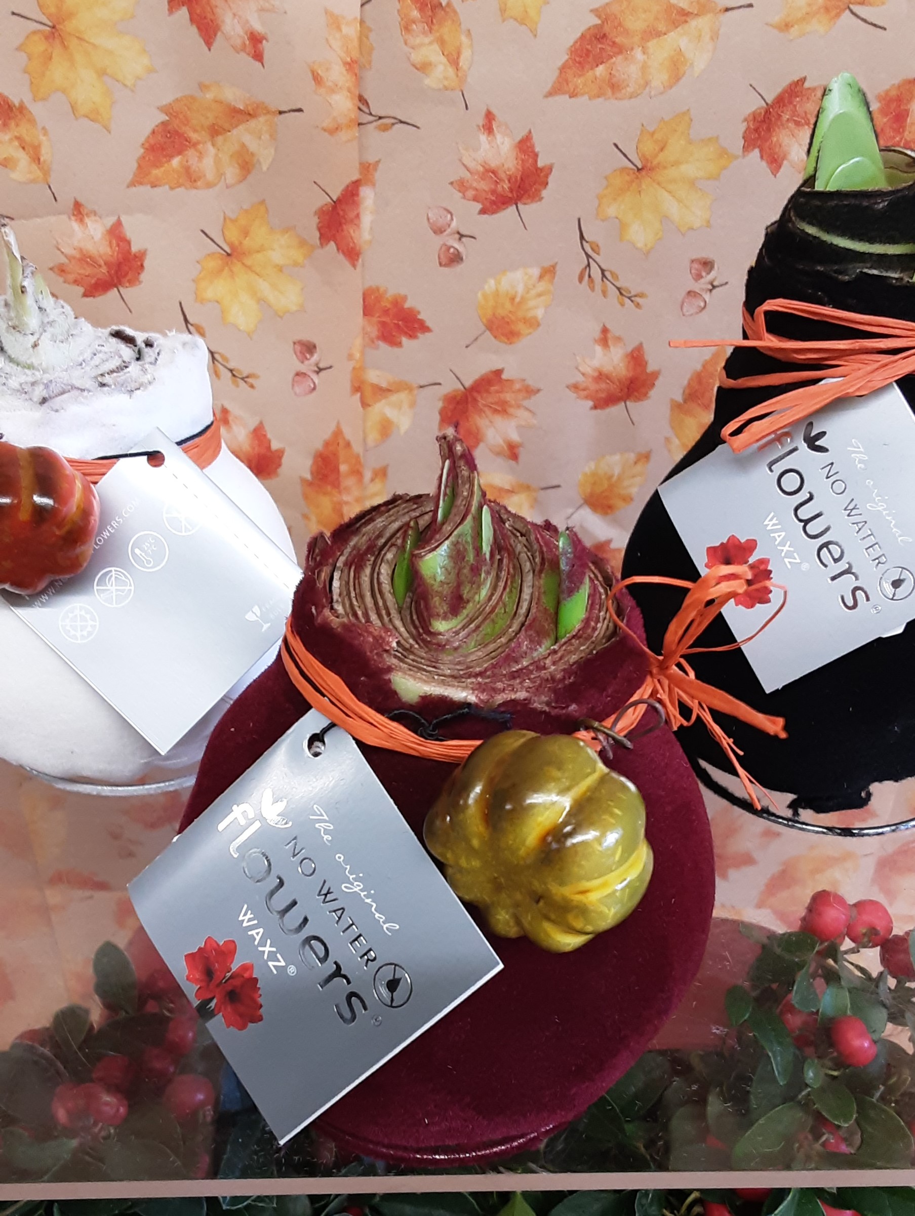 There back! Flowering amarylis bulbs that do not need watering, just watch them develop, magical. They vary in colour and have an autumnal vibe.